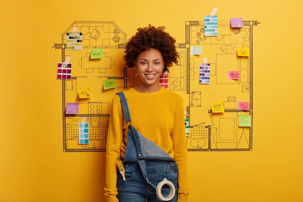 Beschreiben Sie nicht nur „Eiche, Weiß, Messing“, sondern die Entscheidung dahinter: Warum Eiche? Wie beeinflusst Messing die Lichttemperatur? Nennen Sie Raumprobleme, Lösungen und kleine Messwerte. So wird Ästhetik nachvollziehbar und Expertise spürbar.